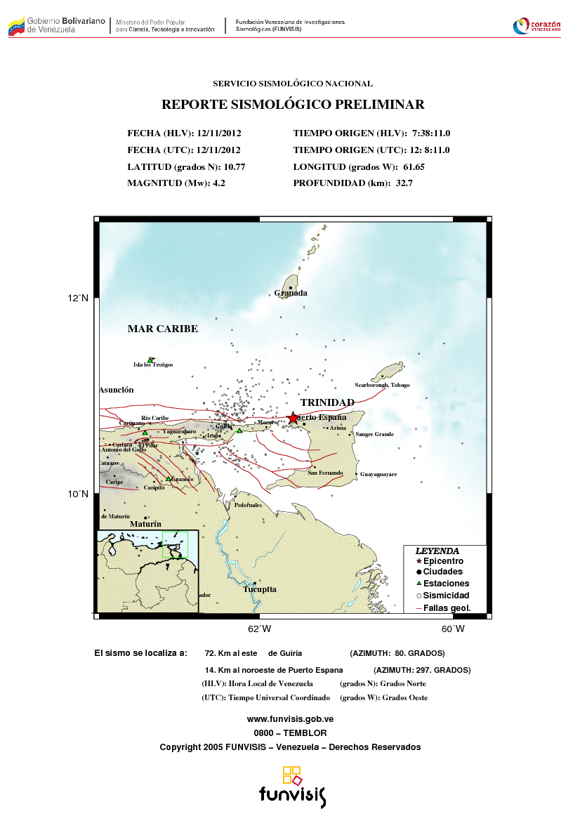 La Fundación Venezolana de Investigaciones Sismológicas (Funvisis), informa a la población que hoy 12 de noviembre de 2012 a las 07:38 HLV fue registrado un sismo de magnitud 4.2 en Güiria, estado Sucre.